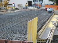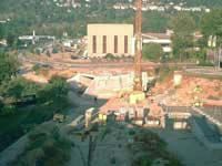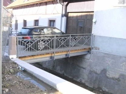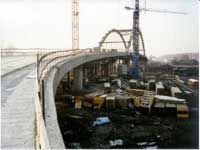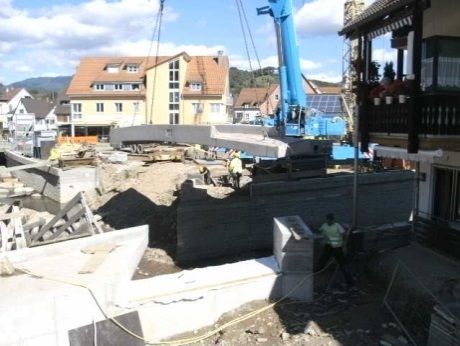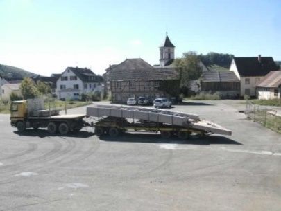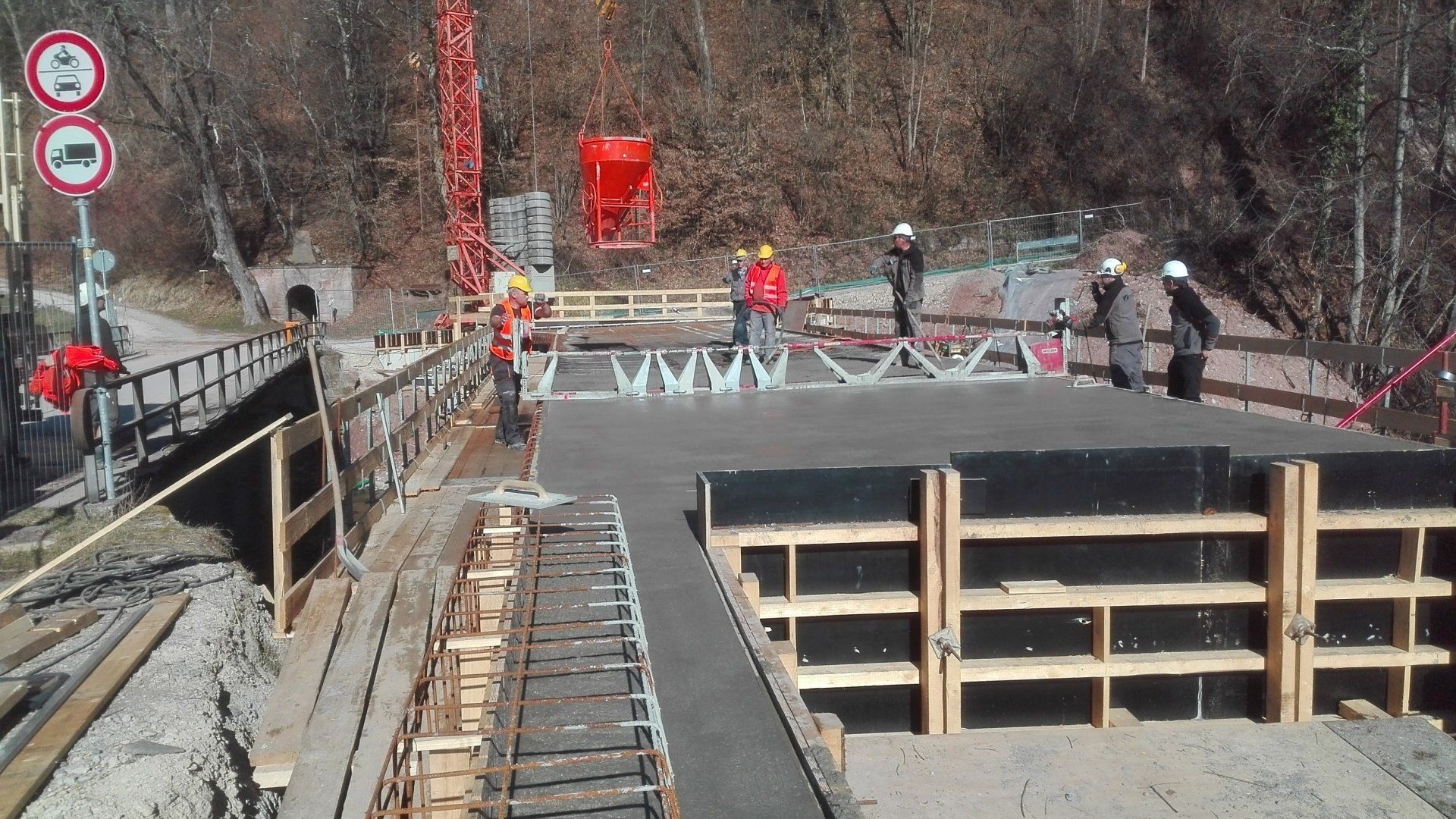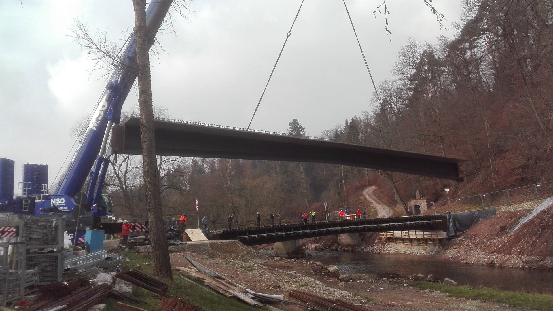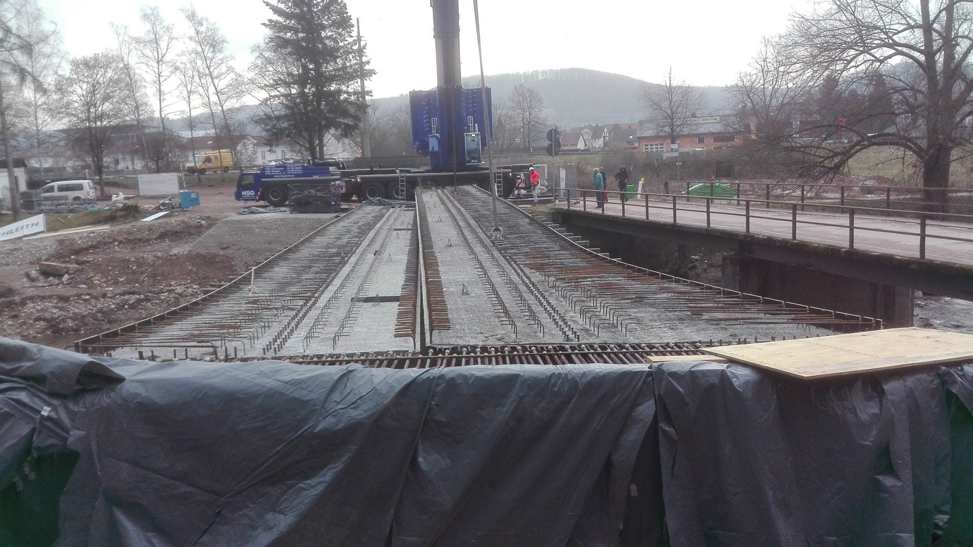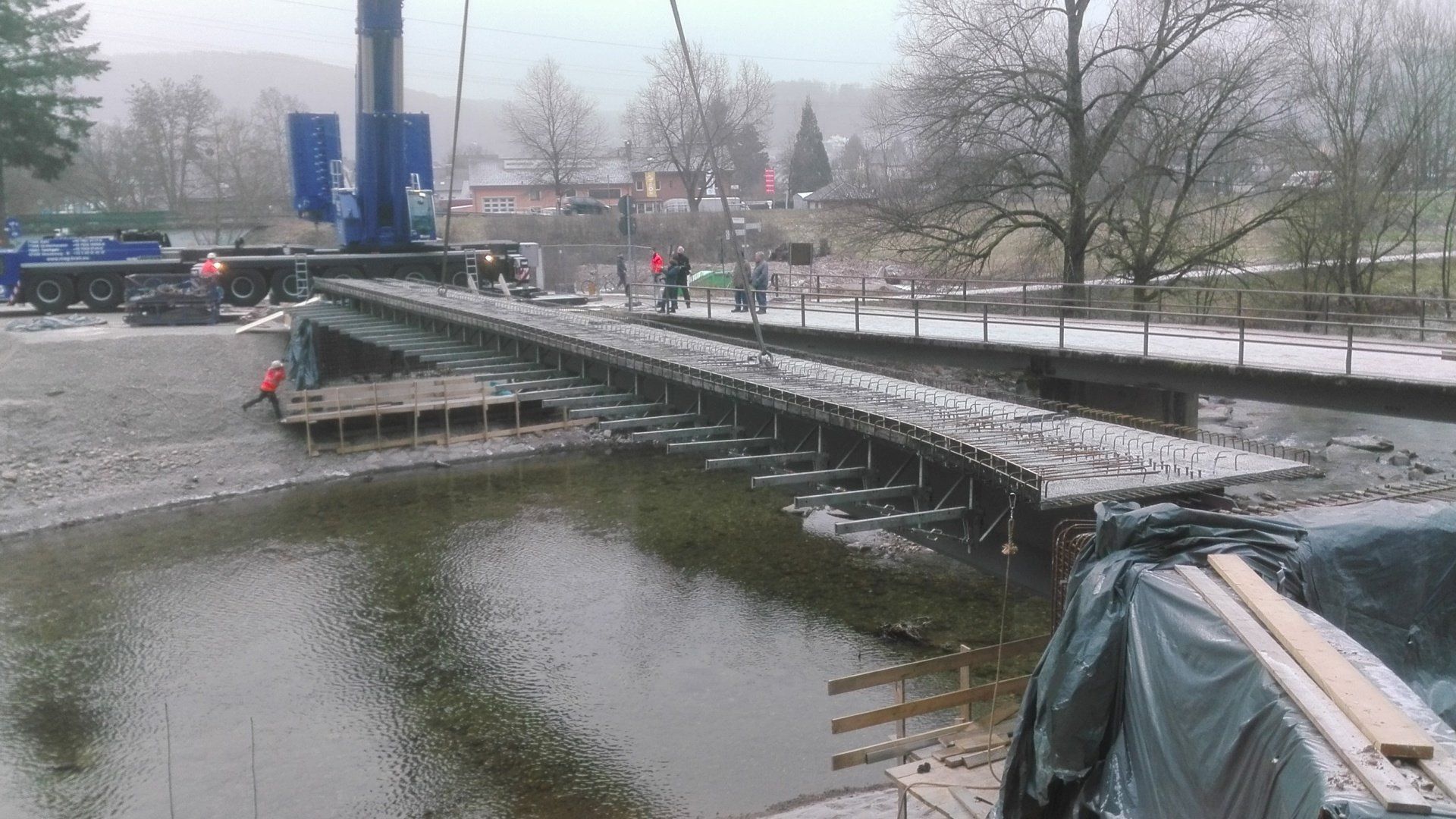 Der Brückenüberbau wurde in zwei Teilen als Beton-Halbfertigteile, die an die Stahlträger an betoniert wurden, auf die Baustelle geliefert. Die Fertigteile hatten ein Gewicht von jeweils ca. 43 Tonnen. Sie wurden mit einem 400 Tonnen-Kran auf die Widerlager eingehoben.