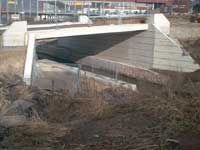 Aufgrund der Einspannmomente aus dem Überbau wurden die Widerlagerwände in einer Stärke von 2,0 m – und die Flügelwände in einer Stärke von 80 cm hergestellt. Auf der Nordseite wurden die Flügelwände im Radius von ca. 12 m aufgeweitet. Widerlager- und Flügelwände stehen auf einer 1,2 m dicken Fundamentplatte, in der die Pfahlköpfe der Microbohrpfähle verankert sind.